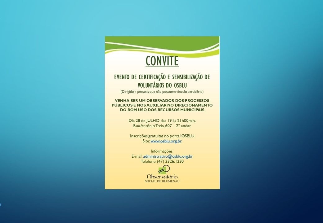 O evento será em Blumenau no dia 28 de julho e irá certificar os voluntários que já atuam no observatório como observadores voluntários do Osblu, além de contribuir para atrair novos colaboradores.